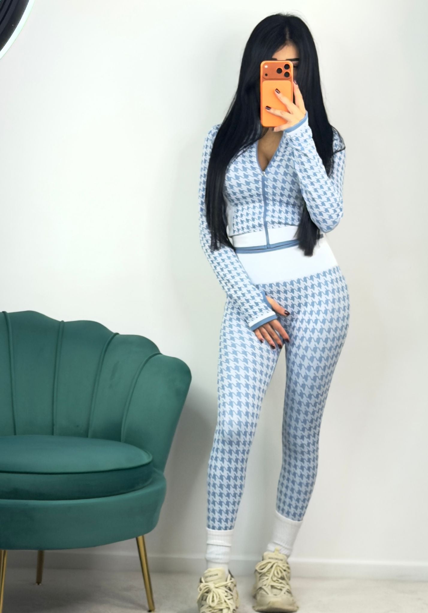 Set aderente composto da top a manica lunga con cerniera e leggings contenitivo e modellante.